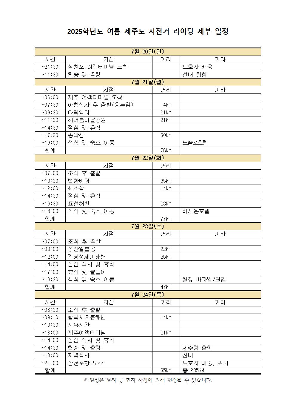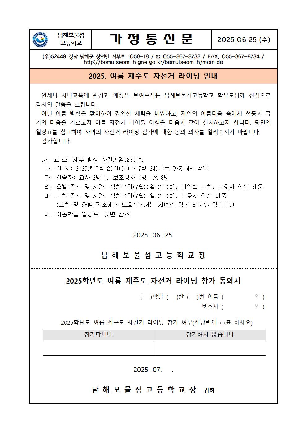 2025. 여름 제주도 자전거 라이딩 가정통신문