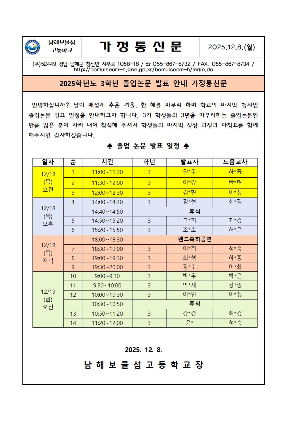 2025학년도 졸업논문 발표 안내 가정통신문
